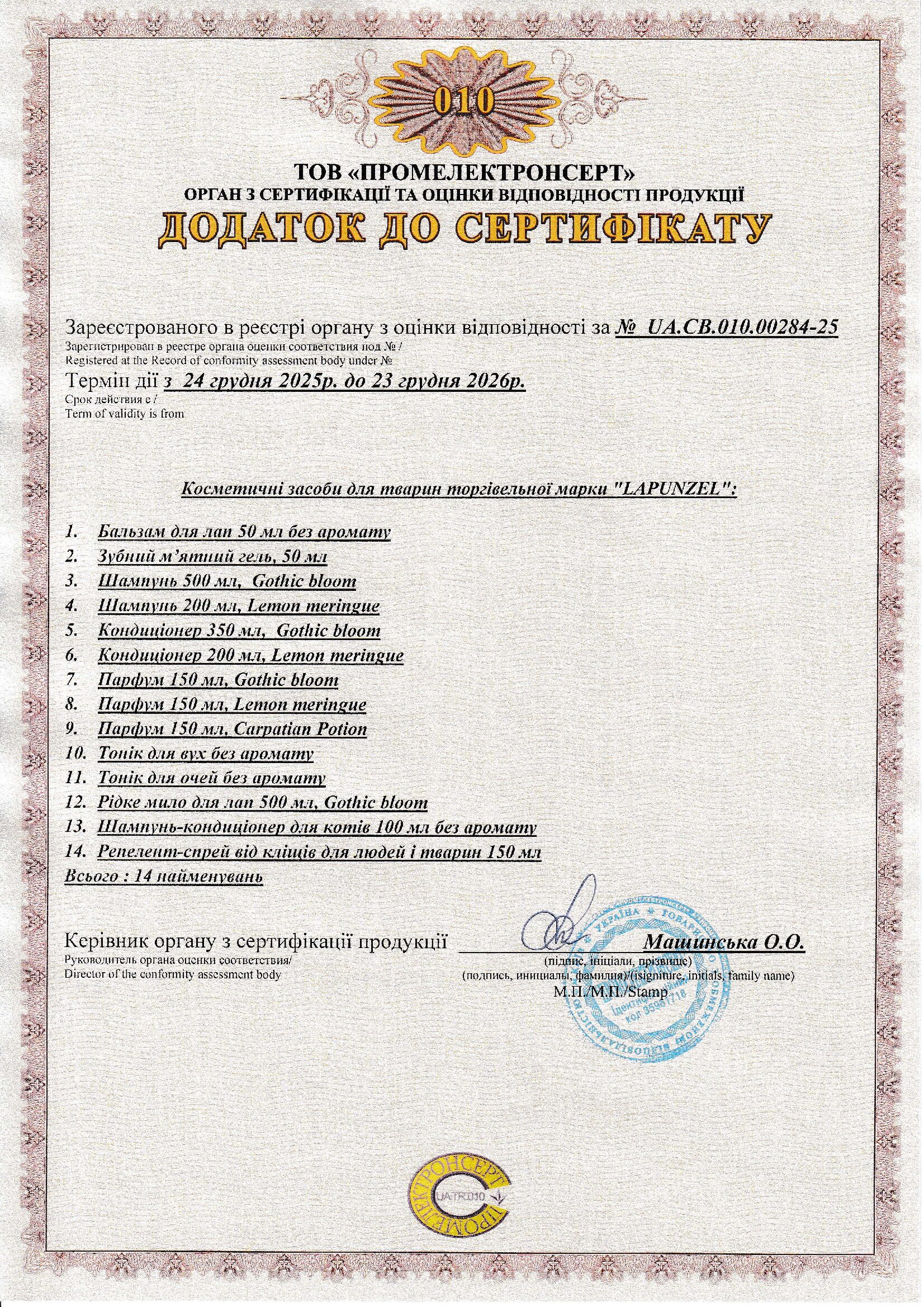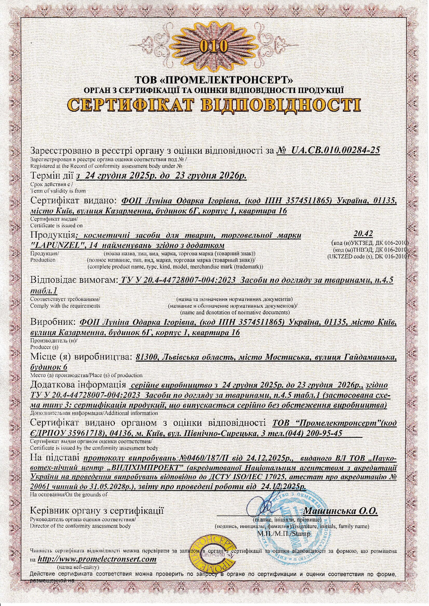 Продукція Lapunzel має чинний сертифікат відповідності в Україні, що підтверджує її безпечність і дозволяє легальне серійне виробництво та реалізацію.