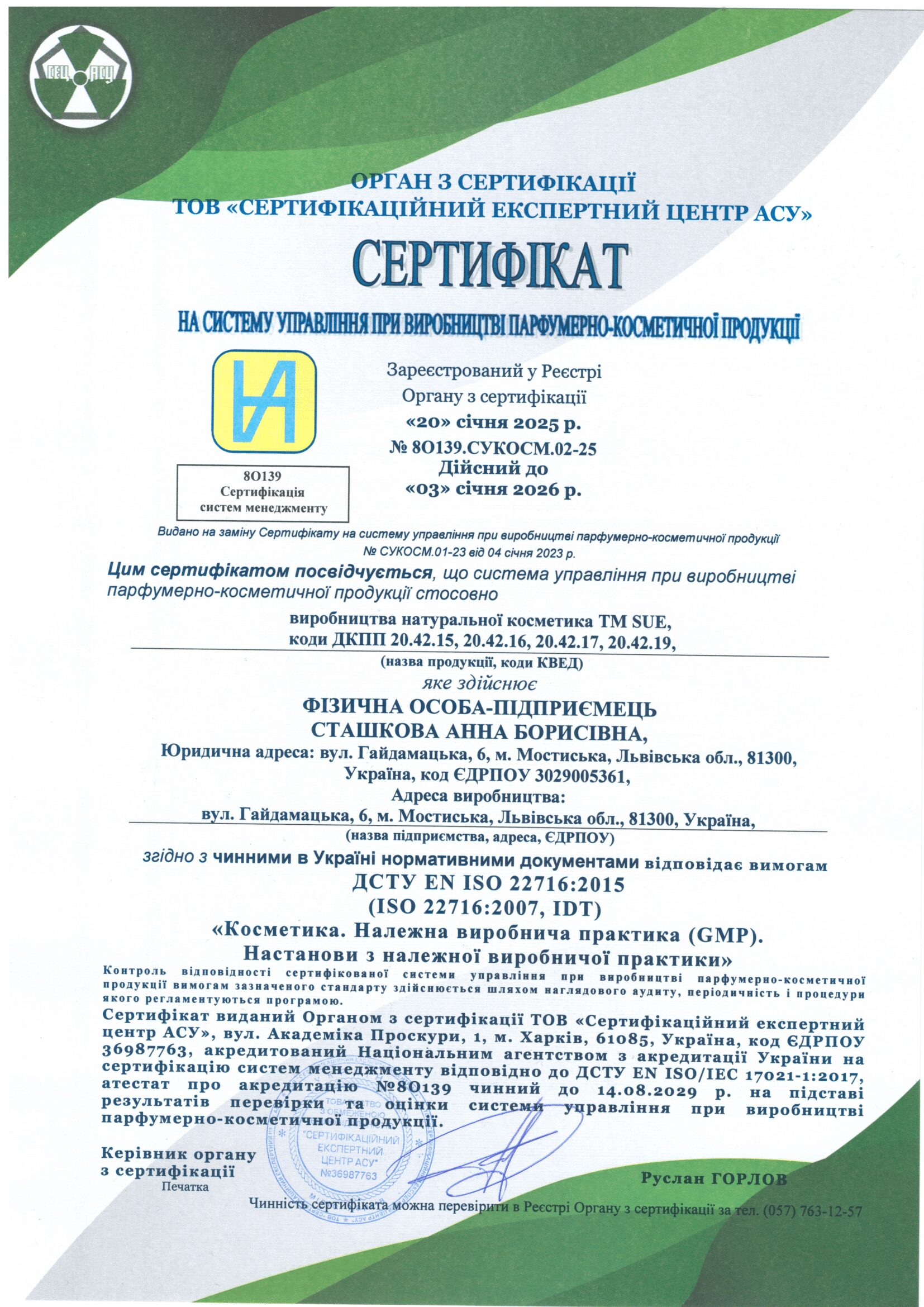 Це підтверджує, що виробництво дотримується належної виробничої практики: використовує перевірену сировину від сертифікованих постачальників, забезпечує контроль